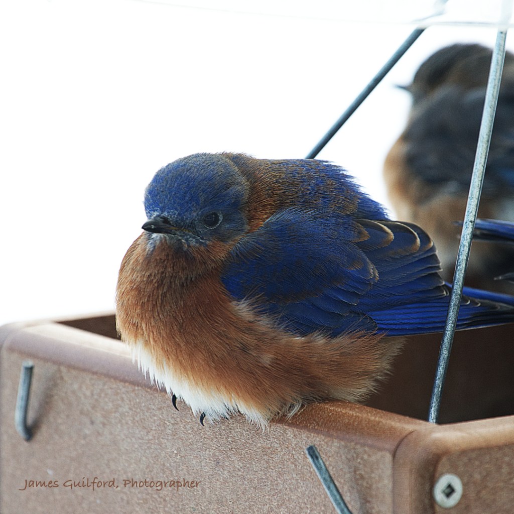 Tufted TitmouseA male Eastern Bluebird, puffed up against the cold, along with four others, perches on the edge of a platform feeding station.European Starlings fill the platform feeder to capacity as they devour the seed within.Not all visitors to the bird feeders were birds.