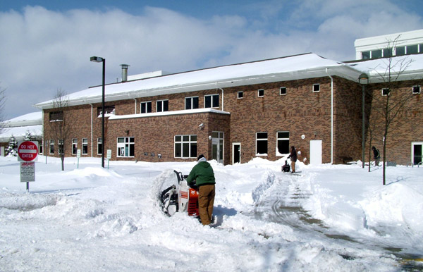 I got to work just fine today (my weekend to work). No real trouble getting up the hill out of our condos. Our city streets were packed snow but the state roads were fine as were the freeways. When I arrived the snow crews were on the property in force. They'd cleared the lots pretty well but the drive-up window couldn't be driven up to. This photo will give some idea of what they had to work on. Tomorrow ought to be pretty easy by comparison! A pretty, snowy day, or a pretty snowy day!