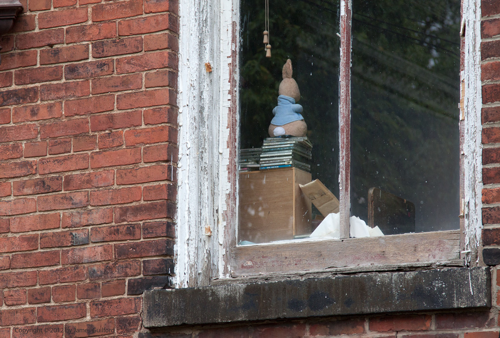 I stopped for lunch in Garrettsville, Ohio today. It’s an interesting old town with strong historical links to President James A. Garfield. The village also has one of the best Subway sandwich shops I know of. So after an enjoyable lunch I did a little walk around the downtown area spotting several good photo-ops; one such opportunity was the back window of one of the main street shops. Certainly the window sash and frame could use some attention, but I loved the texture of the wood, the weathered paint, and the ancient brick and stone of the building. Spotting the carefully-placed little toy bunny through the old glass was wonderful.