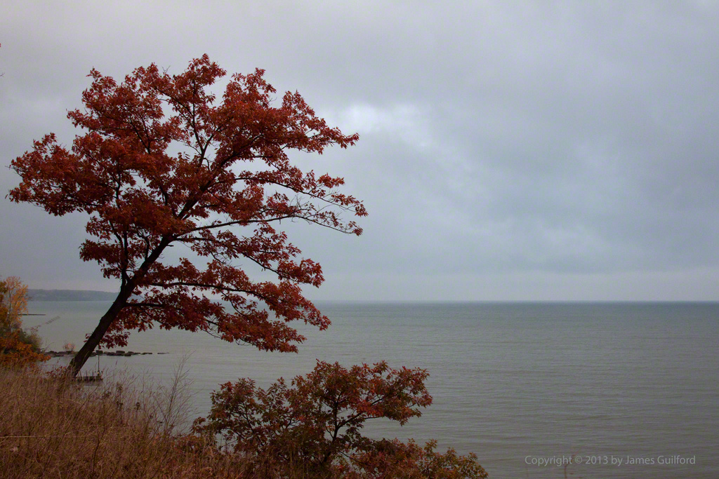 Typical of November, though usually late-November, today was chilly, wet, and gloomy. Braving some morning sprinkles, I ventured near the lake with my trusty old Canon EOS 50D. I thought, at the very least, I could capture some interesting cloud or mood shots; and I did. What turned out to be my favorite was, however, a surprise. I spotted a tree clinging to a lakefront cliff — one I’ve photographed before — enrobed now in deep-red colored leaves. Even in the subdued light of a cloudy morning, the tree stood out against a backdrop of gray clouds and slate waves. As a bonus, light processing brought out subtle coloration in the dark lake waters. I spent too little time on this morning of moody mists and watercolor landscapes, before light rain forced me away.
