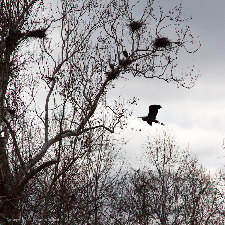 Now Arriving: A Great Blue Heron arrives at its rookery bearing a tree stick for its nest on a gloomy Sunday in late March. Nests are pretty much complete and it was quiet, this afternoon, at the rookery. The big birds are sitting on nests, standing in the grasses below the nesting trees, waiting for hatching; then the real work begins!