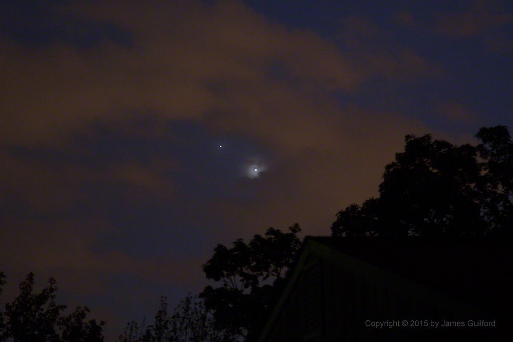 We have been watching planets Jupiter and Venus drawing closer and closer together in our evening skies. Tomorrow, June 30, the pair should be 1/3-degree apart — close enough to look like a brilliant double star! Chances are we won’t see the event due to expected clouds, typical of this season. So last night, with thin broken clouds interrupting the view, I set up my camera to catch what I could. I was pleased to see a bit of drama as brightly-shining Venus created its own nebula in Earth’s clouds.