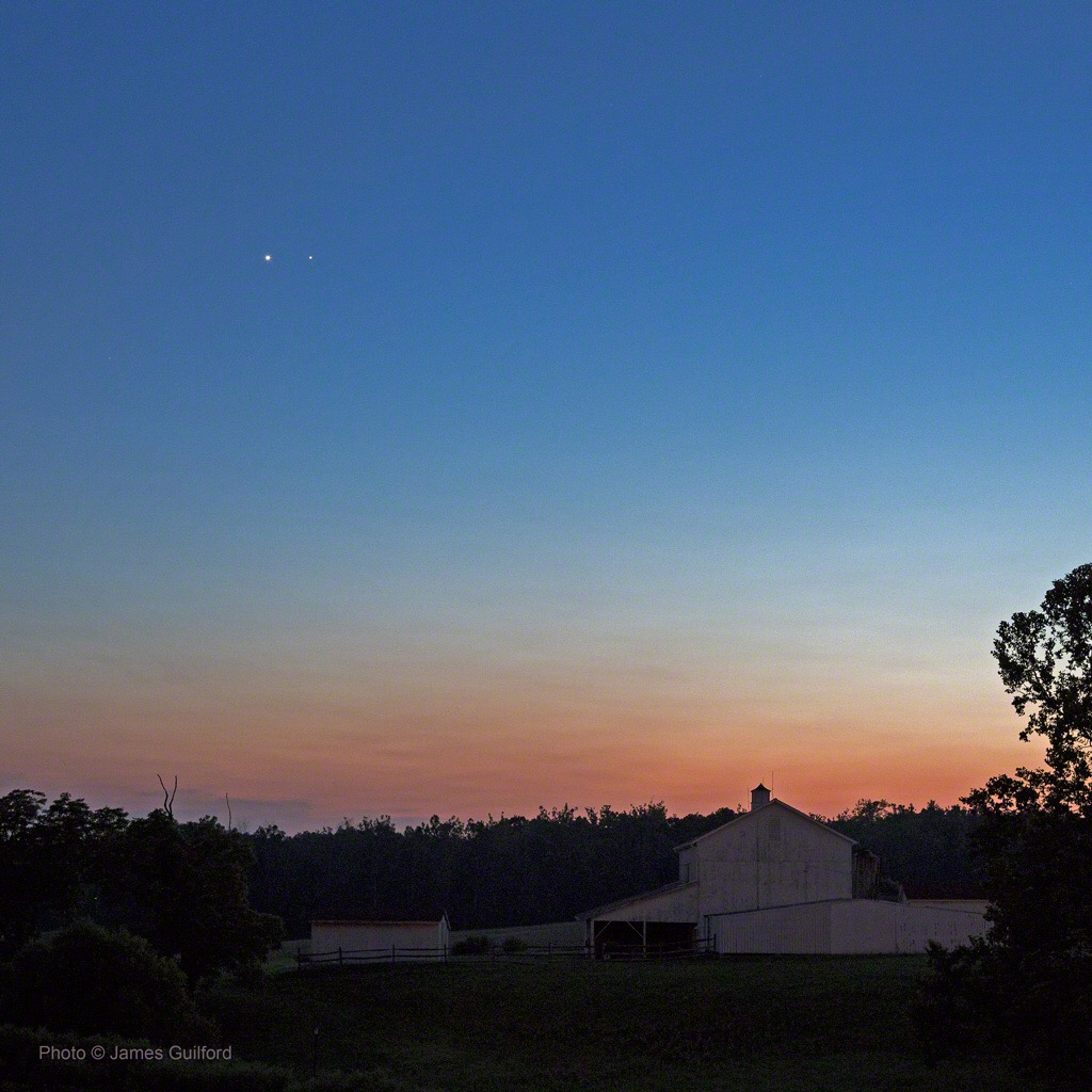Venus and Jupiter are seen slowly parting company in beautiful twilight. We had mediocre seeing conditions June 30, the peak night of the recent planetary conjunction, and solid overcast the following night. So with July 2nd’s clear skies, I headed out for an effort at getting a landscape photo featuring the planets. It worked out well.
