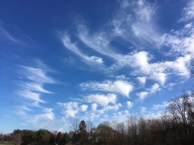 The skies were doing amazing, wondrous things this morning, icy high-altitude plates and waves, crosshatched ripples and streams, and shiny iridescent colors. In the afternoon varieties of cirrus took over, feathery strokes of white paint on blue. Yes, a show of wonder. #ohwx #clouds #cloudporn