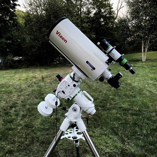 In order for a computerized equatorial telescope to aim at the celestial targets one seeks, it must be sitting level, it needs to know: where it is (latitude and longitude), what time it is — down to the second, the location of a couple of bright stars, and have its axis of rotation perfectly aligned with Polaris — the North Star — actually a specific point in space near Polaris! If you get all of those right, computerized mounts are great; you simply tap into a control device what you want to view, tap another button to tell it to “go-to” the target, and bibbidi-bobbidi-boo, motors whir, the telescope moves, and in a few moments you’re enjoying wonders of the universe. If you get everything right. If you don’t get everything right, it’s frustration and mosquitoes in the dark.