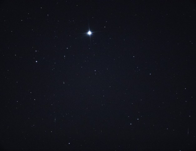 My photos, though certainly not spectacular, revealed more galaxies than I’d yet seen in my lifetime. Barnard’s Galaxy (not pictured here) was revealed by the camera. I shot a photo of the star Mirfak because I thought it would be pretty with diffraction spikes. When I viewed the image on my computer, several small streaks with central bulges showed up — distant galaxies in the background!