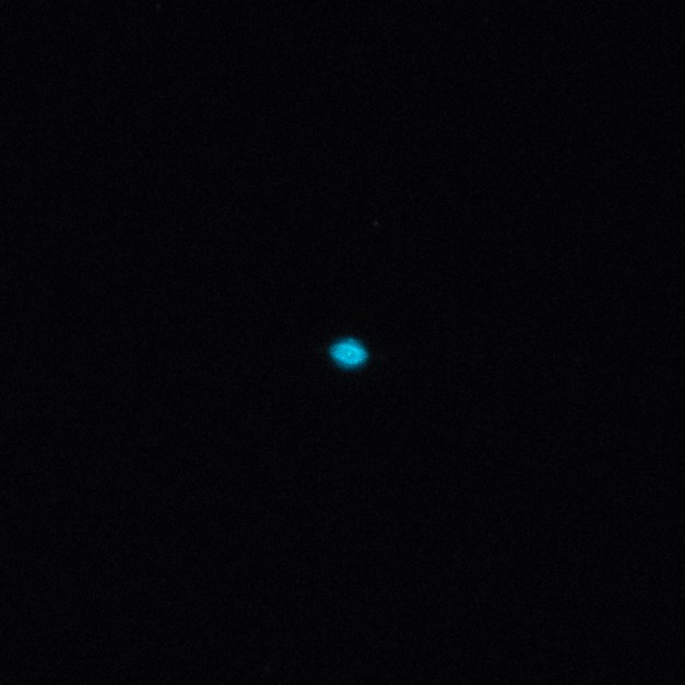 A first viewing and new fascination of mine is the Saturn Nebula: a planetary nebula around 5,200 light-years distant, which resembles planet Saturn in shape only. It’s a beautifully complex cloud of star-stuff that photographs in vivid color. Its image via DSLR is disappointingly small and required much cropping to see in any detail. I was delighted to capture a bit of its complexity and I’ll be visiting the object repeatedly for viewing and photographic challenge.