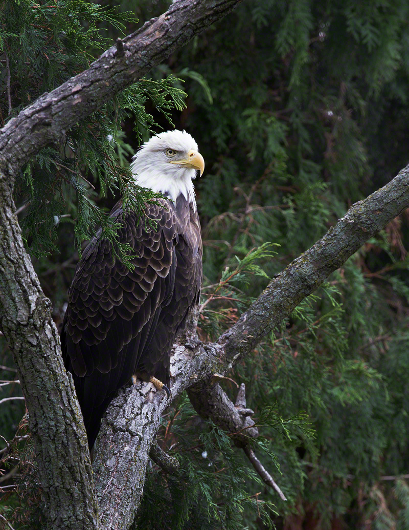 Because the woods are full of herons, smaller birds and animals, raptors are also present. I had been told about hawks and eagles being around and occasionally spooking the Great Blues but I hadn’t seen them. This evening, however, was different. First one motorist, then another visitor flagged me and described where a Bald Eagle was perched. The first site was distant, in the shade, with strong backlighting — none-too-photogenic. The second site, however, put the eagle in a fairly decent position for photography: well-lit with the sky behind.