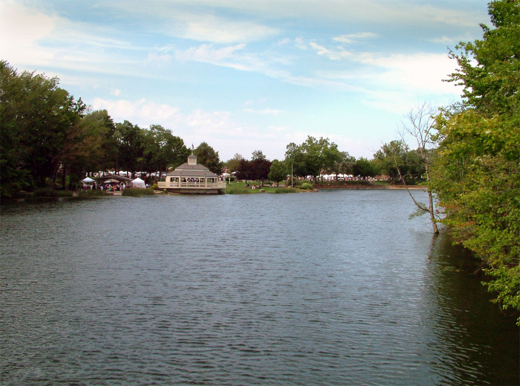 I was spending too much time in my home office this morning, shut off from fresh air, moderate temperatures, and sunshine. So I headed out, camera bag in tow, to lunch at Chipotle's and a mini-tour of nearby nature areas. First was the Strongsville Wildlife Area, a wetland with restricted access in the form of a permanent observation blind for public use. From there I watched an egret hunting and catching small fish. An elegant white swan floated nearby amongst a small crowd of raucous ducks. I used the telephoto to capture a few photos there and of bees collecting pollen and nectar from plants along the path. Then it was on to the Wallace Lake area of the Metroparks, seeking a great egret I frequently see there. That bird is particularly shy when I'm there with a camera but close to the path and road when I'm on a commuting trip. Today was no exception. I shot a few photos of the bridge to downtown Berea and the water fall (lens tests and "art"), a few of the distant egret, then off again towards home. Along the way I spied the sign I regularly pass: "Cleveland Metroparks System / Beyer's Pond." Never been there. Have time? Yes! So I did a three-point turn on the quiet road, pulled into the lot, and hiked down the soft mulch-covered path. Beyer's is a beautiful body of water –still and dark– with lily pads and flowers in the quiet ends and wood duck nest boxes staked here and there. I didn't see much in the way of wildlife but shot a few photos of the water, lilies, flowers, and bees. Finally off for home.