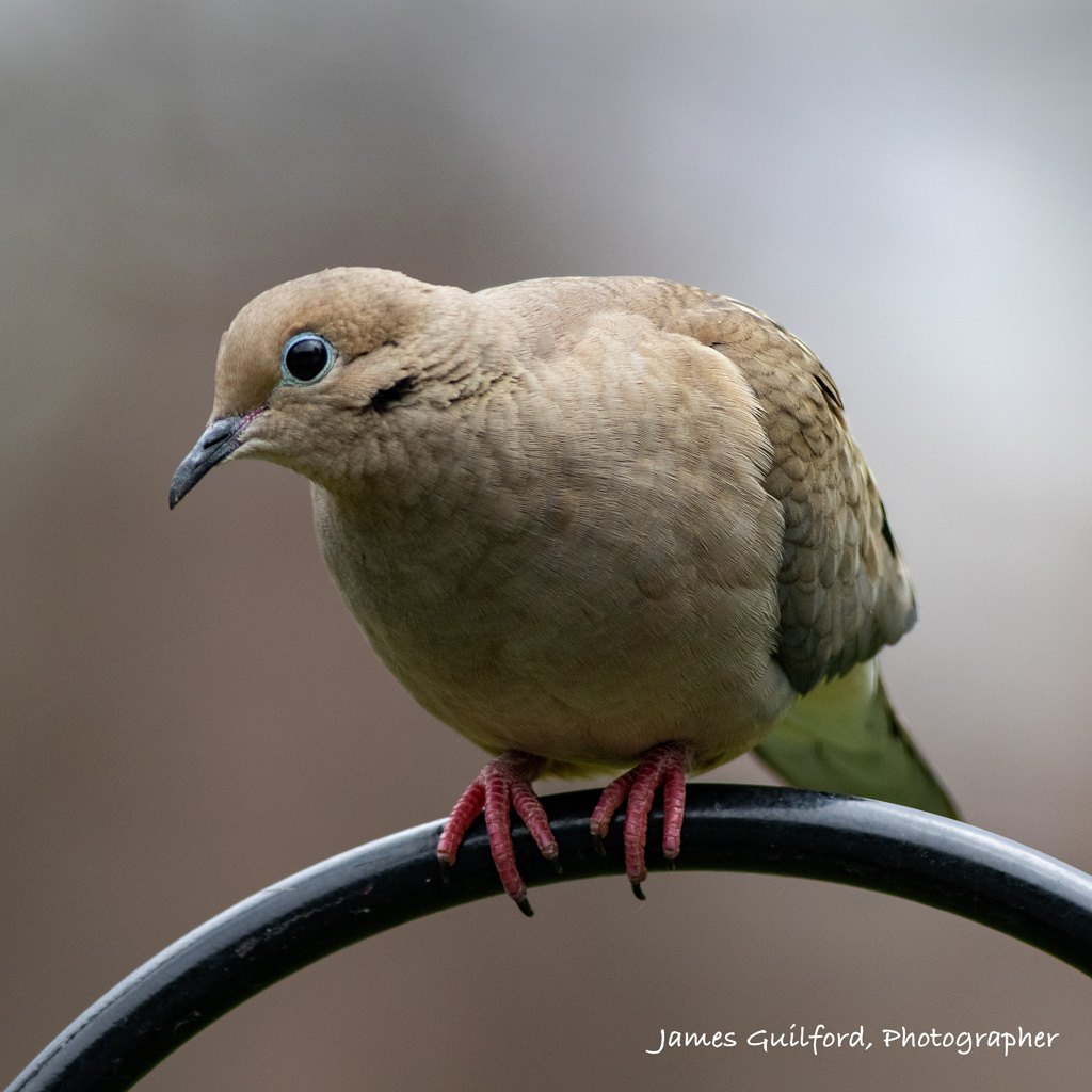 Feed Me? Mourning Dove is perched looking for spilled seed to scavenge. The green coloration is light reflected from lawn grass below.