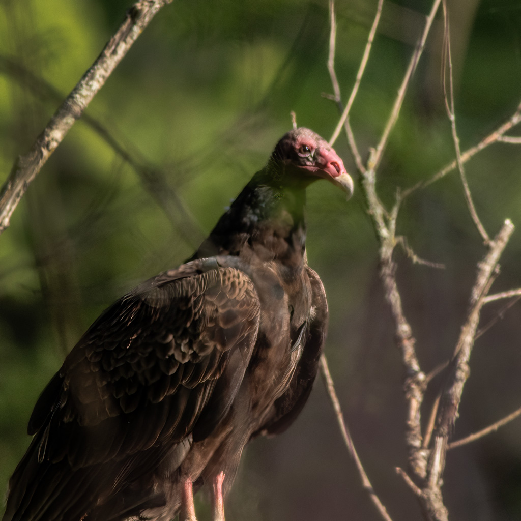 With fascination and puzzlement we watched a number of Turkey Vultures (Cathartes aura) aka “buzzards” zooming low over the house and in and out of our bare-limbed, backyard trees. From the trees they dropped down into the gully behind our house. What drew their interest? I don’t know. During a pause in their activity, I went out to peek into the area they were visiting, I was expecting to find a dead deer or other animal they’d been scavenging. I saw nothing. Still, they returned and stayed at least into dusk. The big birds (six-foot average wingspan) returned today but seemed content to remain perched ominously in the tree; at one point there were *13*. Happy Halloween, I guess!