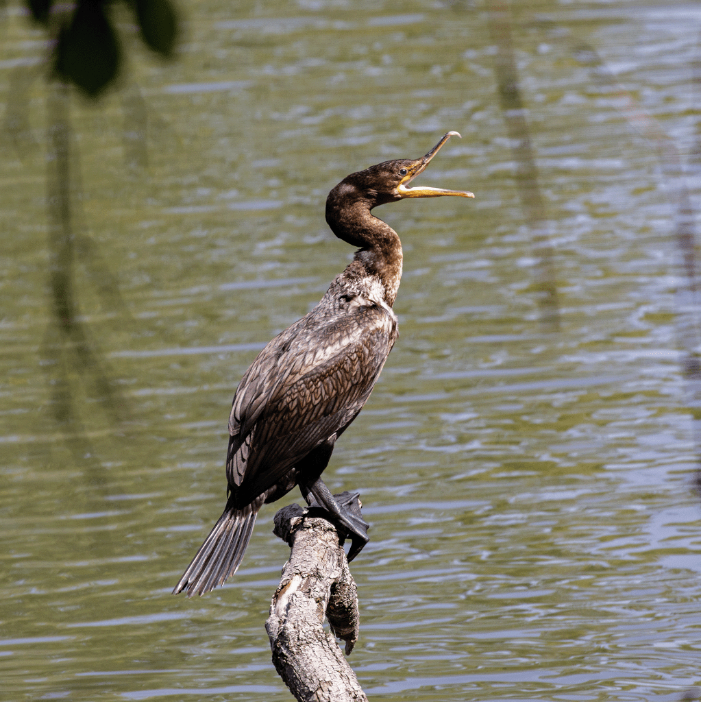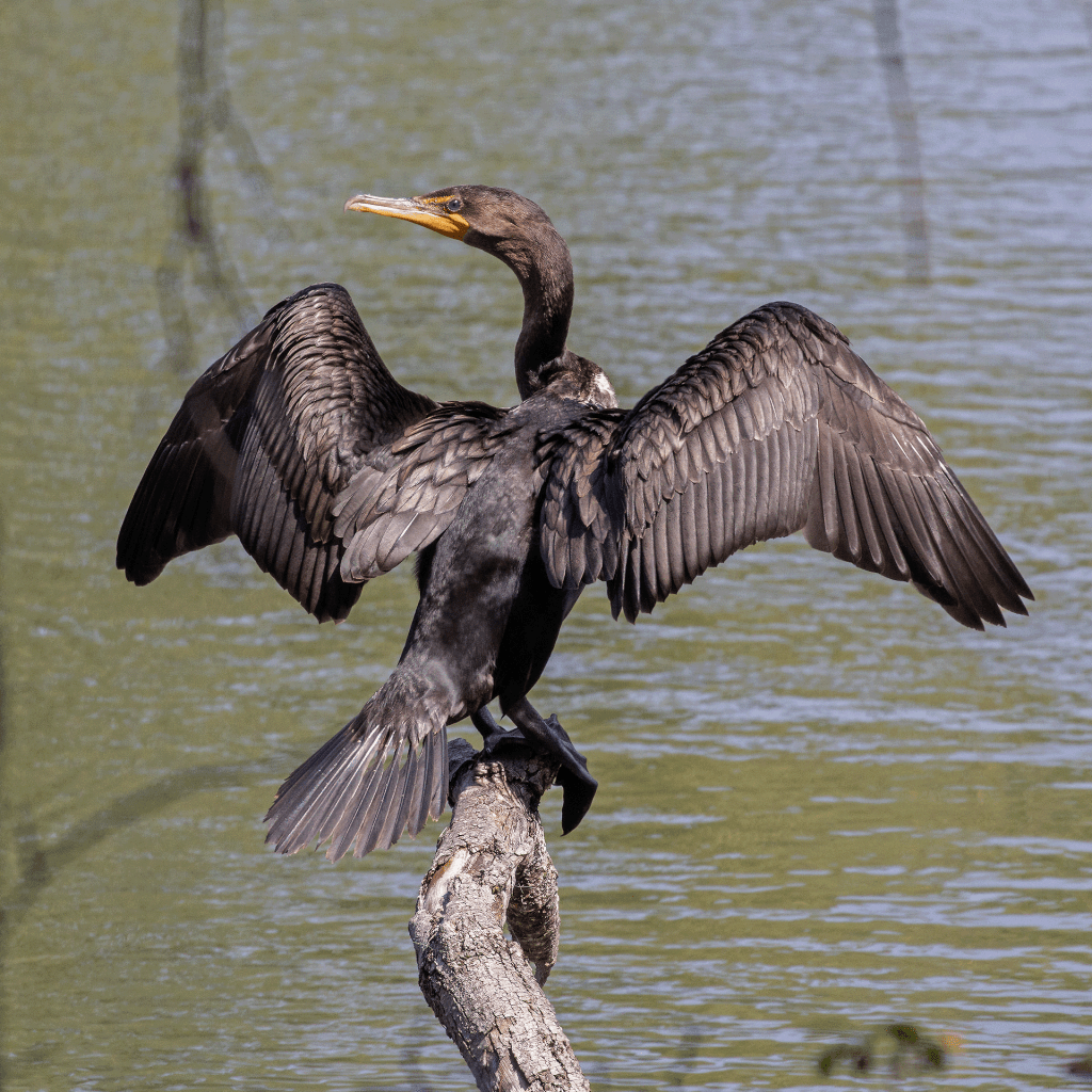 Recently I thought I’d caught glimpses of a cormorant flying over the far side of our pond but I couldn’t be quite sure. Yesterday, I noticed a large bird perched over the water on a fallen tree branch and there it was — a double crested cormorant! Not an uncommon bird but this is the first I’ve seen one here. The bird spent most of the day on that branch basking in the sun, looking around, occasionally swimming, mostly just hanging out. I haven’t seen it today.