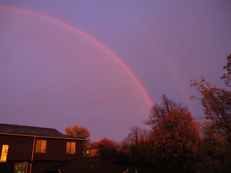 The incredible color of the sunset drew me out on to our balcony for my best vantage point on short notice. I got my slippers soaking wet and a few stray drops of rain on the camera … worth every bit of it. I looked to the darkening eastern sky and what should present itself but a huge, arcing rainbow –actually a multiple bow– spanning most of the horizon. Had to try and capture that image too. The little Canon G11 was just adequate to the task but, true to the reason I bought it, was at hand when needed.