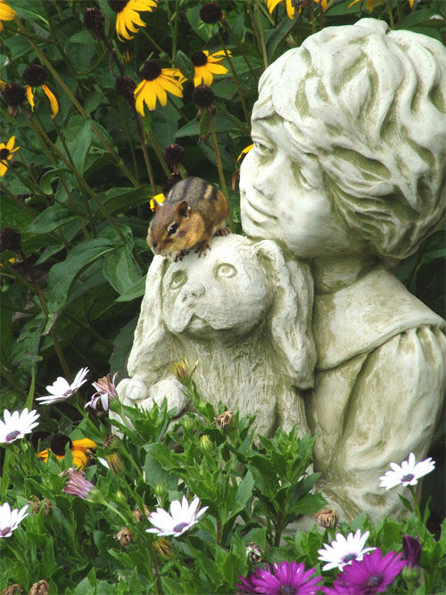 We stopped by the vet's office during our Saturday run-arounds. The cats are fine but we had a bunch of used insulin syringes to leave off for proper disposal. Dr. B. gets enjoyment from gardening around his hospital building and at the front door, among the flowers, stands a small statue. Perched on top of the statue was a chipmunk, holding very still, his cheeks full of food. I just happened to be carrying my camera so I hoped the critter would keep his position on the statue and would still be there as I left. Camera at the ready I opened the door to leave and found the little guy continuing to pretend he was a part of the statue. The chipmunk regarded me silently and motionlessly as I aimed and squeezed off several shots. Here's what I got! I love the way the stone dog and boy appear to be gazing lovingly upon their furry friend. We'll probably make a print of it for Dr. B. & Co.