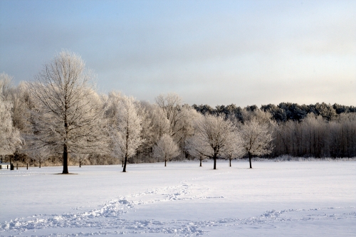 Driving to work this morning was both a pain and a pleasure. It was very cold this morning; en route my car's thermometer hit a low of 4 degrees (F) on the east side of Strongsville. At home and in many areas along my route, hoar frost had coated very twig producing an amazing landscape at every turn. It was a beautiful trip but painful to resist the urge to play hooky, wade through the snow, and take photographs everywhere I went. Helping little, I told myself to simply enjoy the passing view and not worry about photographing. Still, I did succumb and pulled into a conveniently located Metroparks parking lot immediately adjacent to an open field lined with flocked trees. The sun was just beginning to illuminate the treeline when I shot the last of my morning's pictures.