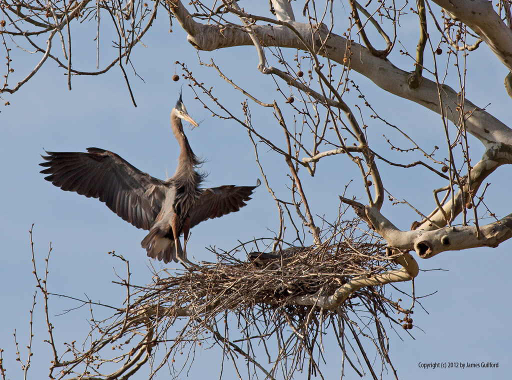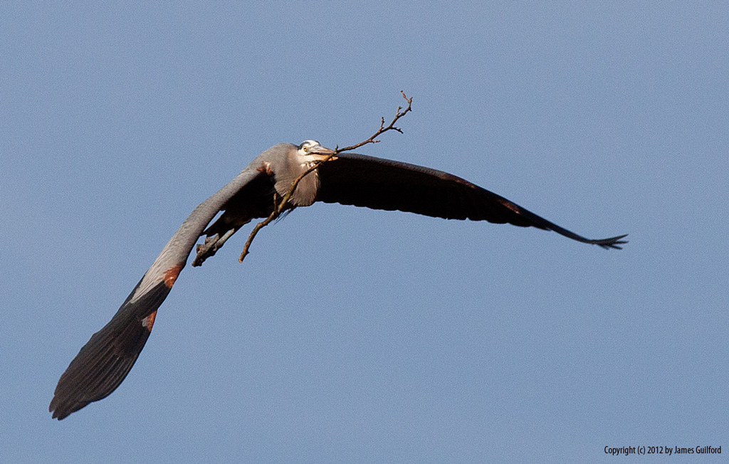 Lunging from the nest, the collector begins another cycle of careful selection and delivery of construction material. Soon chicks will appear in the nests and then, for mom and dad heron, the work really begins!