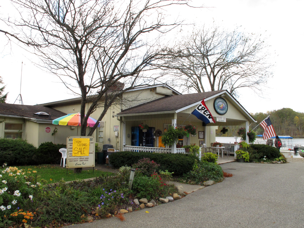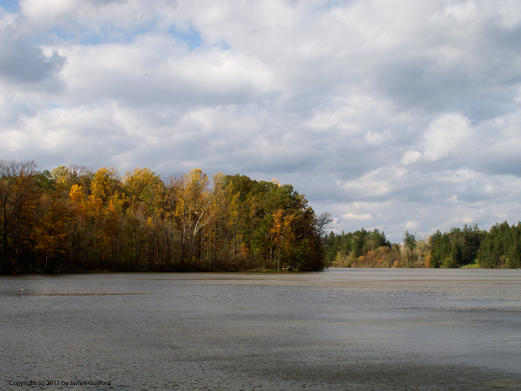 It was a very blustery day. Any autumn leaf that was thinking about dropping to the ground had its decision made for it by 15- to 30-mile-per-hour winds. Early in the day it was dreary and overcast. Later, openings appeared between the clouds. We were on our way home from a bit of shopping –She needed new jeans– and decided to make a quick stop at Hinckley Lake. Spots of sun drifted over the color-dappled trees and whorls of ripples spread on the surface of the water as the wind drove through the valley. I had my little Canon PowerShot G11 with me and so made some photos. The stop was brief but beautiful. Robbing a bit from the joy of the moment was discovering the cozy little boat rental and outdoors shop, the Hinckley Lake Boathouse, was going out of business. Stepping inside we found the shop nearly empty and a lone employee idly minding the cash register. {I hope to learn more of the circumstances but it sounds like Cleveland Metroparks may have chosen to not renew the owner’s lease and will take over the property.}