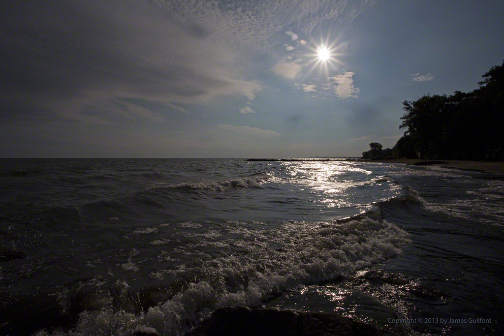 I stopped by the Lake Erie shoreline again Saturday morning. The sun was breaking through some high clouds and I wanted to see the interplay of morning sunlight and lake waters; It was exciting! The waves, while not large, constantly smashed against break walls and crawled up the sandy beach. The sky, to the east and south, was mostly clear but clouds were moving in from the northwest. I had a wonderful time, shooting more than 200 exposures of waves, water, sun, clouds, and more. A couple of my favorite “sun” photos are shown here. Maybe, one day, I will post more here or on my gallery site. For now, these will have to do.