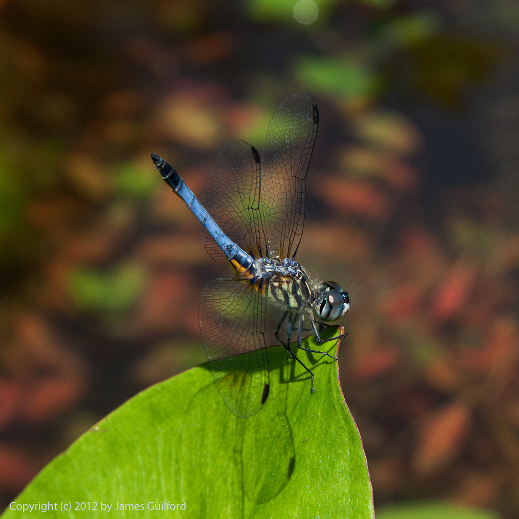 During our visit to Schoepfle Garden I was able to continue my pursuit of dragonfly photographs. One beauty was (I believe) a Little Blue Dragonlet (Erythrodiplax minuscula) who alighted on a leaf not far from me on that very warm Sunday. I shot several photos in a series, hoping to draw closer and refine my focus. As I watched, he slowly raised his abdomen (tail) higher into the air, pointing towards the sky. I’d seen that behavior before though I don’t think I’ve ever photographed that pose. I thought the insect was advertising for a mate. Apparently it is understood that dragonflies take their “obelisking” posture in order to reduce their exposure to the sun in very hot weather. So it seems that, while a dragonfly may look sexy, it takes hot weather and not hot mates to inspire a Little Blue Dragonlet’s obelisking.