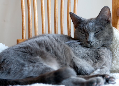 We stayed home this Easter Day venturing out only to pick up a few grocery items. She then retreated to her office to slave away at our tax returns. I took a nap, did some stuff online, and explored the innards of an old microwave oven seeking to restore it to operation: I think it needs a fuse and a switch. Tasha spent much of the day on a newly-favorited chair near the patio window looking and acting like the cat we have known so long. She lost some weight through her recent ordeal but actually looks better for it –Dr. B. says her current 9 lbs.+ weight is not worrisome and, indeed, we believe it's probably better for her than when she tipped the scales at 11 to 12 pounds. Lately she's been sociable, out in the open (not hiding), not scratching excessively, and sometimes getting the "cat-crazies" tearing around the house at full gallop for no particular reason. Yup, that's normal for a cat. Good to see it again.