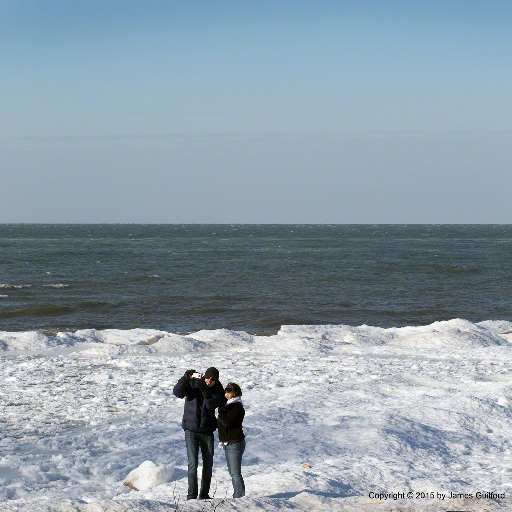 It was a beautiful New Year’s Day so we took off on a cross-country, very scenic drive to lunch in Sandusky. As part of the return journey, we paid a visit to the Lake Erie shoreline and stopped at a couple of parks. Enduring strong winds and freezing temperatures was easy as scenes of wind-driven ice piled on beaches, dark waters, and blue skies inspired me. I wasn’t the only person exploring, however. Briefly checking in at Vermilion’s downtown beach, I spotted a couple from Arkansas standing upon the ice (safely over sand, not water) shooting a “selfie” photograph. I wish them, and you, a happy and healthy new year!