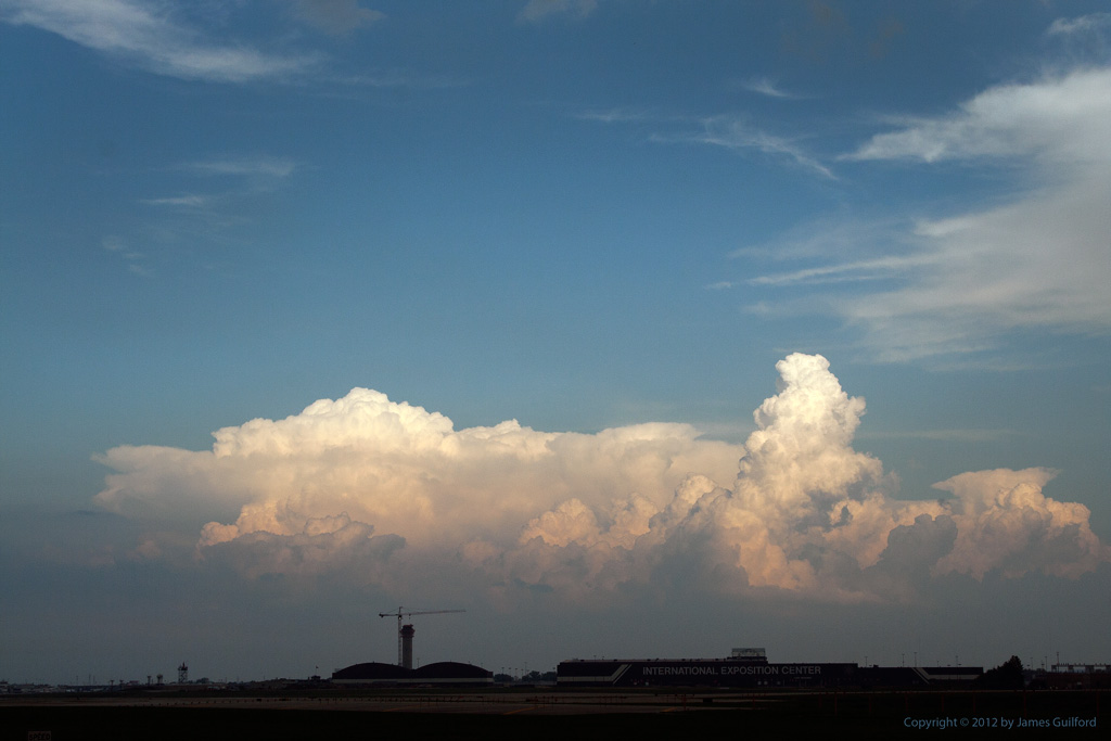 Driving home can be an adventure. Exiting the parking lot this evening I looked to the east and a huge and growing pile of clouds — a thunderstorm was brewing! So I adjusted my route to keep as much open sky around me as possible and headed out. The best vista afforded me was a grassy knoll just off the road, a short driveway for public access conveniently located nearby. The site overlooks Cleveland Hopkins International Airport so there was plenty of open space between me and the photogenic clouds. I popped from my car, hiked to the top of the mound, and made my exposures. I was aware of a second storm building and coming on from the west — behind me — but didn’t worry about it until I heard some rumbles of thunder. There I was, atop a rise and near an open area with a thunderstorm about to overtake me. Time to move! So, it was back to the car. Light rain had set in and my route now carried me into tree-lined streets and suburban settings not well-suited to sky photography. I’d planned a stop at Heinen’s Fine Foods so headed down a busy four-lane street. The storm rolled over us!