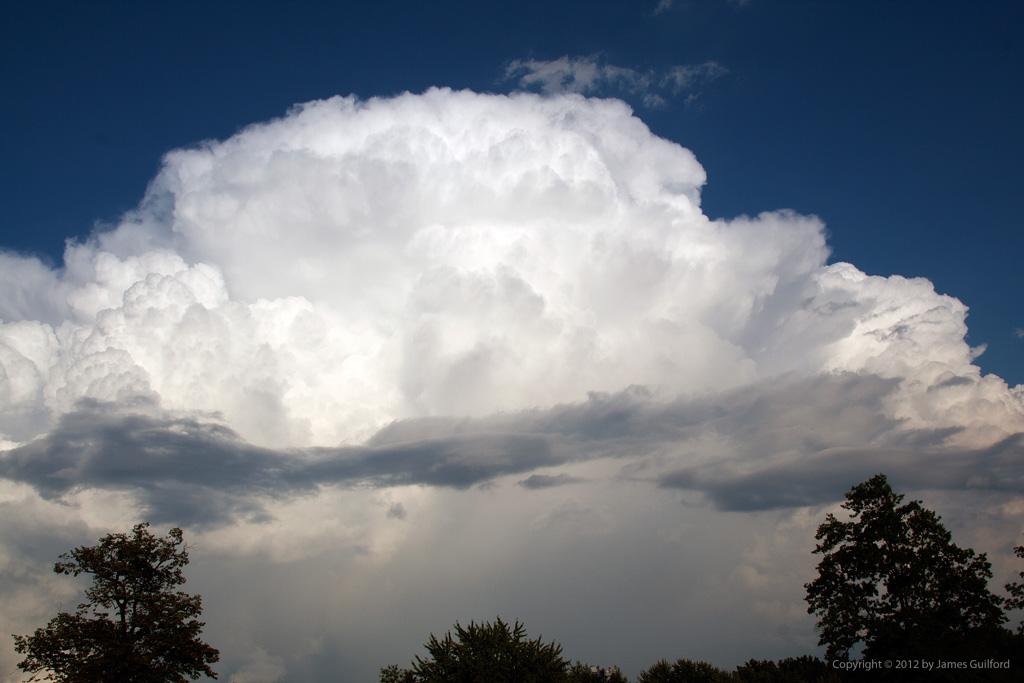 The eastern sky, however, was now filled with the towering clouds that had just unleashed such chaos. Near home I made one more weather-related photographic stop. From a parking lot overlooking church lot below I tried to take in the scope of the storm clouds now passed; it was still too close, too large to capture in one shot. So I give you this image of one slice, exposed for the clouds with the sky turning an unnatural deep blue. Yes, a simple drive home can be an adventure.