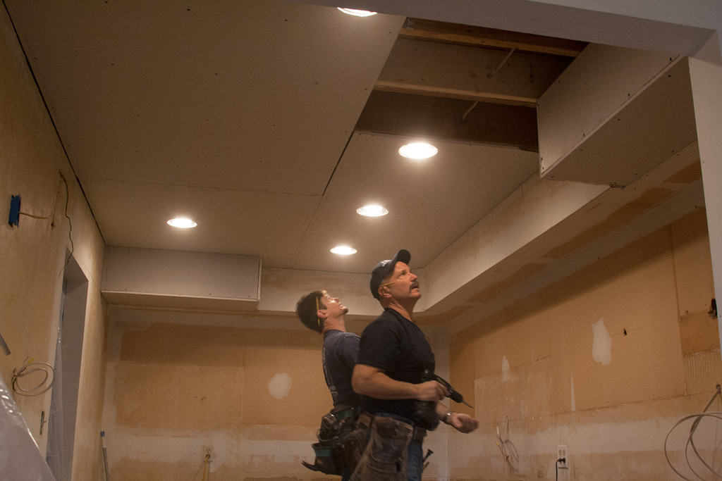The day appeared to start off okay but the only real disappointment of the project took place first thing. It’s all in communication, or lack thereof. The contractor believed the kitchen ceiling was to be given a texture, not finished flat. So the crew obliged by spreading a thick coating of compound on the ceiling, then using a high-quality stamping tool to create a dimensional pattern. Unknown to those present, She Who Must Be Obeyed had a flat ceiling in mind and was quite upset when she learned, too late, that the ceiling had been stamped! We discussed the matter, then I spoke with the contractor and we decided the pattern could be softened a bit by lopping off the points that result as the stamping tool is pulled away — points being features drip-like in shape. Painting should also help soften the look. The focus, I pointed out, will never be on the ceiling so we need to keep it in perspective. Personally, I’d previously thought about what a flat ceiling would look like and I’m not sure that was the right answer though I think the existing texture is a bit too prominent. It will be fine. Better things happened later. The last of the cabinetry was all set, the new over-the-range microwave installed, under-cabinet task lighting went up, electrical was finished, and they were preparing the subfloor to receive its new laminate flooring system. Tomorrow should be really interesting with the first of the flooring due to be installed and the ordering of a beautiful new Cambria quartz countertop!