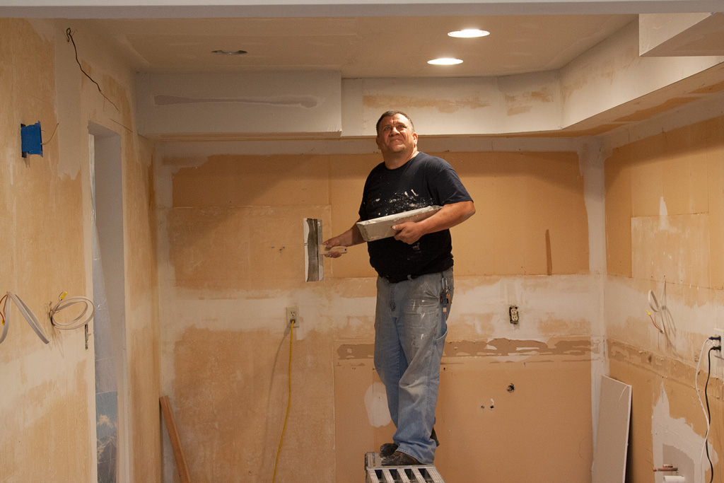Today was the second day of the Great Kitchen Project. It started off right away with drywall for the ceiling going up, followed by a whole lot of other things — much of it drywall work in the space. New wiring was connected to the electrical panel, removed was nearly all carpeting in the living room, up the stairs, and in the second floor hallway! Oh, didn’t I tell you? We’re having the awful, old carpeting replaced with modern laminate “hardwood” and I think I’m looking forward to that about as much as the new kitchen! The stairway treads were trimmed to accommodate the new laminate kits that will fit over them. Of course, all this meant complete disruption of the main floor — I space I found reasonably comfortable from which to monitor activity, answer questions, and serve as doorman. Cabinets are set to arrive tomorrow morning.