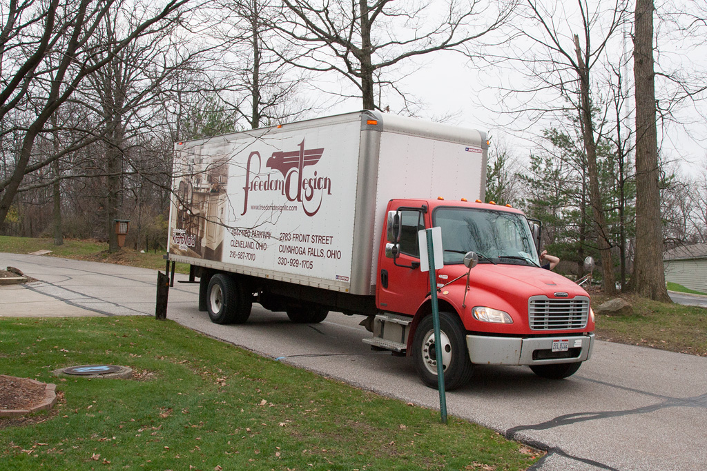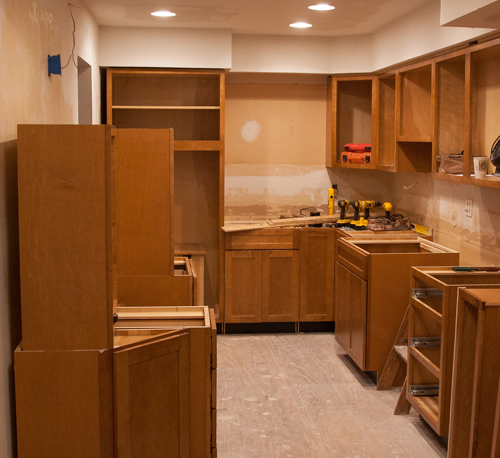 Today was the big day: the cabinets arrived! The already-chaotic living room area of our little place was filled with big boxes — a few really big boxes — containing brand-new cabinets and components from Kraftmaid, an Ohio company. Not long after the delivery truck departed the boxes were opened and their contents placed in their approximate locations within the kitchen space. Already, things were looking better. Many things would have been better than the way the kitchen looked last night but the beautiful new woodwork did spur the imagination. Eventually the first upper piece was hung in the far corner, then another, and another; then some base units were set. Every time a new unit was placed, the crew carefully measured, leveled, adjusted, fitting each precisely in its final spot. The only hitch that developed during the day was that the hot water line should have been designated for movement as was the drain pipe. Not a big deal, but it will slow progress just a bit. Stacked in a corner of the living room is the new laminate flooring and, as I’ve already said, I’m really looking forward to the new floor!