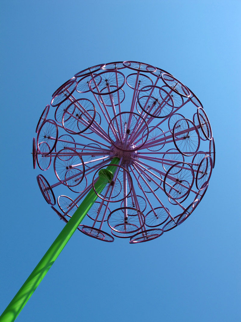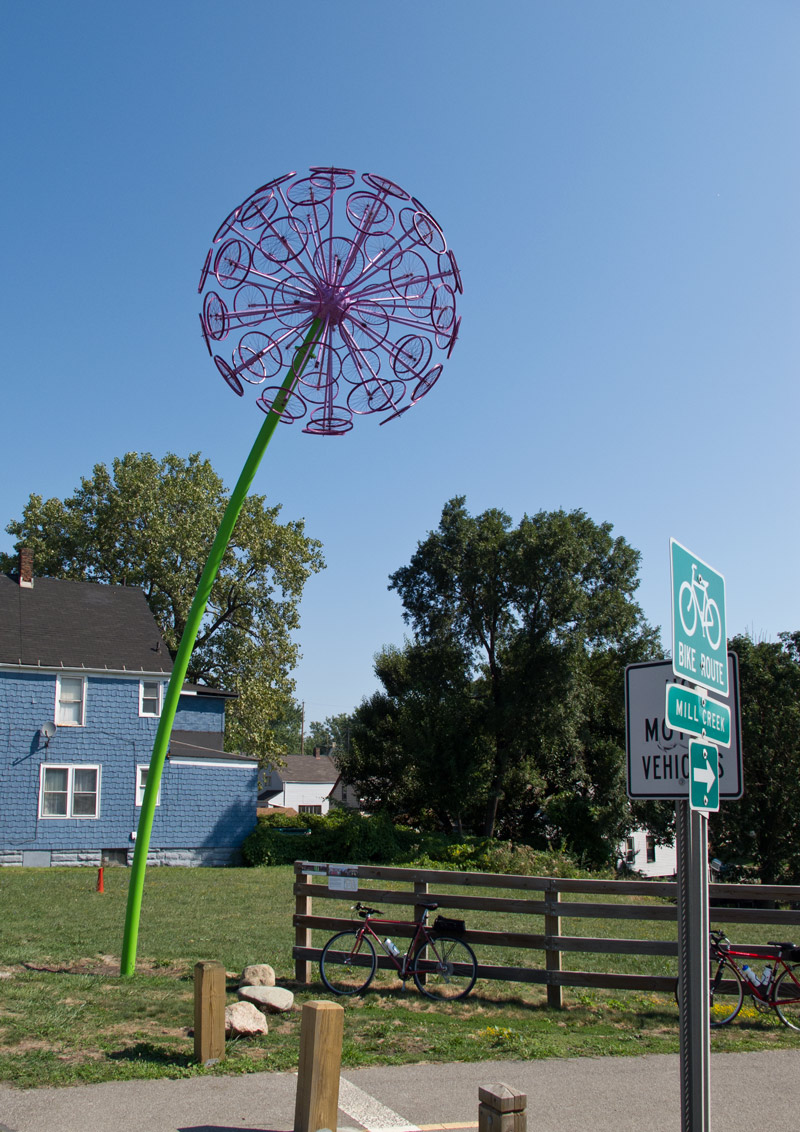 Today we did a bicycle ride of 20+ miles checking out a new section of bike trail. The new section, we thought, went into downtown Cleveland. It doesn’t and we somehow managed to get off course. Portions of the trail follow the course of the Ohio & Erie Canal and the Cuyahoga River, all greener and more beautiful than one might expect. The big surprise of the day? We spotted a Bald Eagle perched atop the bare upper branches of a tree near the river! The trail emerges into neighborhoods and industrial areas where, in one case, we scaled a challenging hill on a road that was all bad news. We did survive, however, and made it to the northern end of the line –an eastern neighborhood area of Cleveland– where we discovered the large, whimsical sculptural piece we’d hoped to see. The piece, “rotaflora” by Jake Beckman, is in the form of a flowering garlic plant and the flower head is made from bicycle wheels!