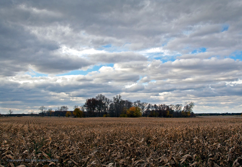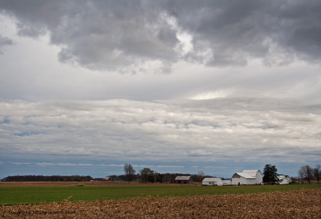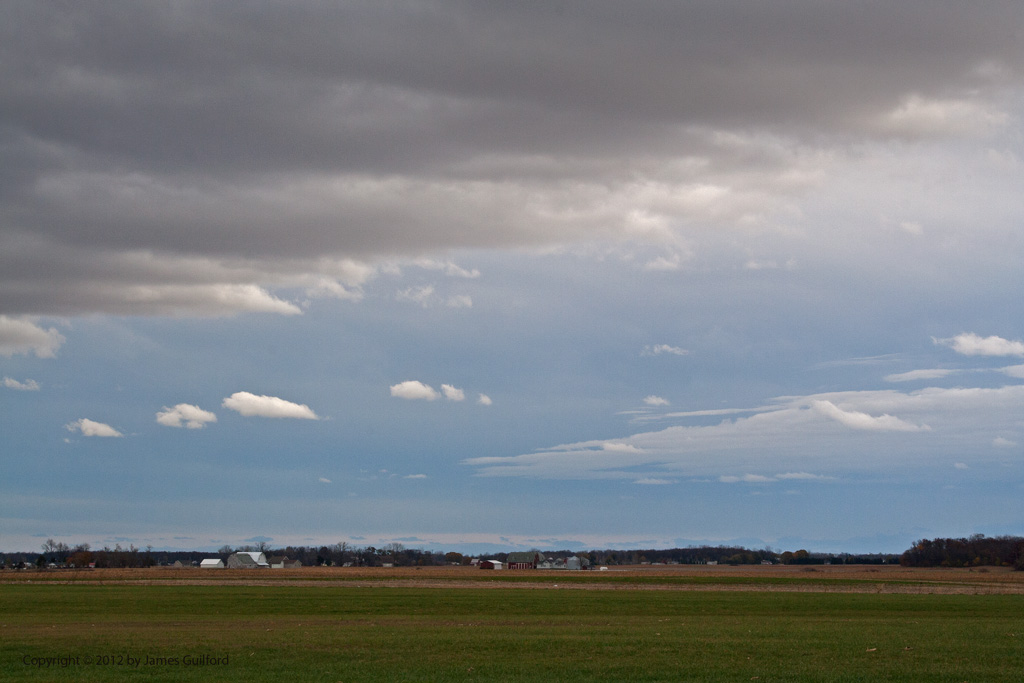 I was visiting relatives in Northwestern Ohio, driving from one town to the next, when clouds near the horizons caught my eye; it almost appeared the clouds were collapsing on to the farmland below! The wide, open views of flat farmland, along with isolated areas of falling snow and graupel produced fascinating scenes.