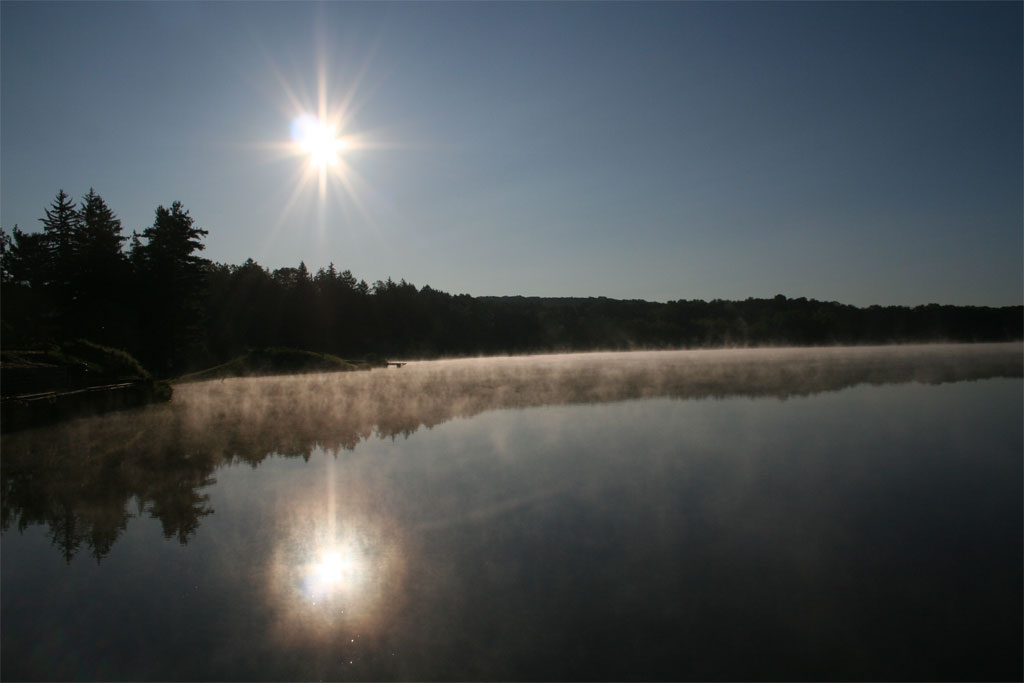 It was a beautiful morning at nearby Hinckley Lake where I went to enjoy the quiet early day. It's a needed respite which will help me prepare for the long day ahead; a day which will include working til about midnight on a computer server that is on its last legs. Here we see the early sun shining through mists rising from the still surface of the lake. How I would have loved to spend more time there and how I would love to go out tonight — the skies should be wonderful for astronomy. Alas, I must work to earn an income. Money may not buy happiness, but it helps!