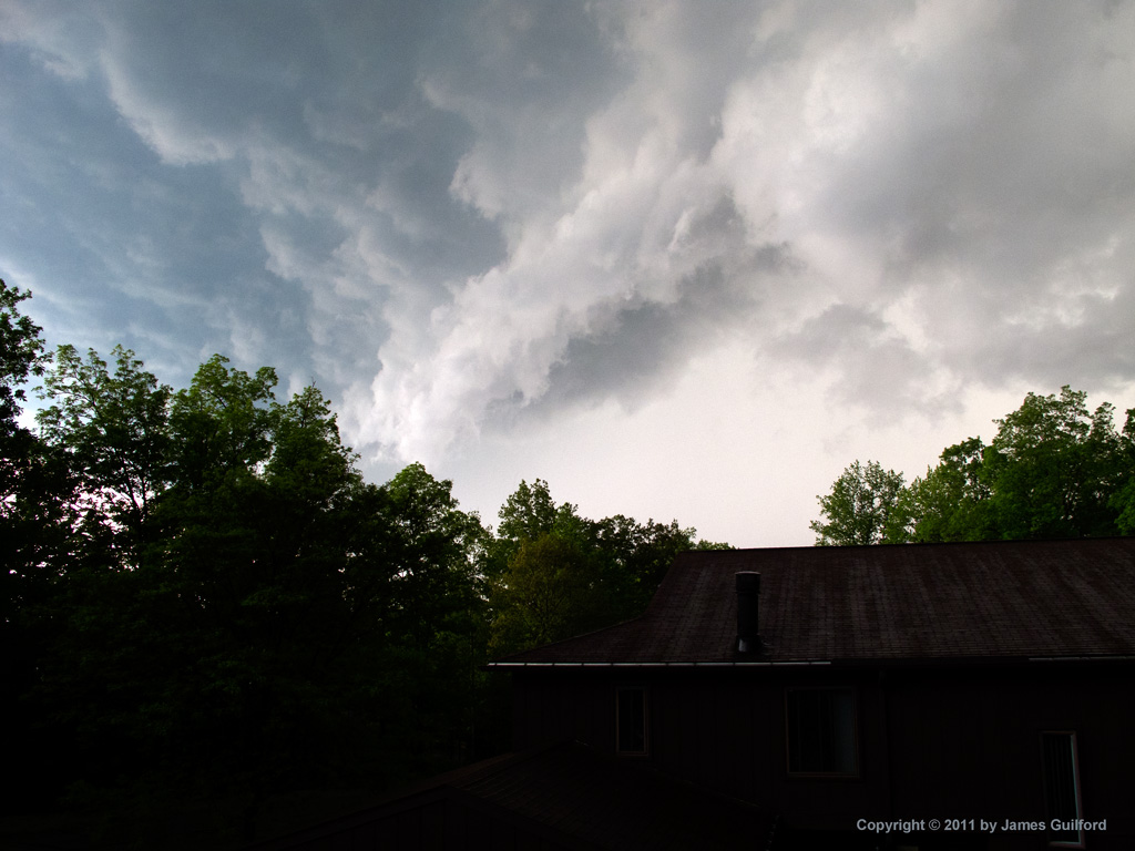 Strange sky with cloud shapes that would have been at the outside edge of a tornado-producing thunderstorm to the left. Final shot before taking cover.
