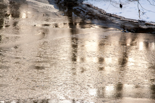 On an outing this afternoon I stopped by the Metroparks' Mill Stream Run Reservation and explored the frozen landscape. I photographed shadows, animal tracks, snow, and the stream. It was 16 (F) degrees so I did not stay for long. Hands sore from the cold, I made my way back towards my waiting car. As I crossed the small bridge to the parking lot, I stopped to gaze at the frigid water. For just a moment the ice turned golden.