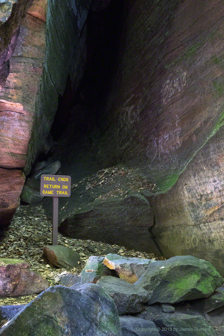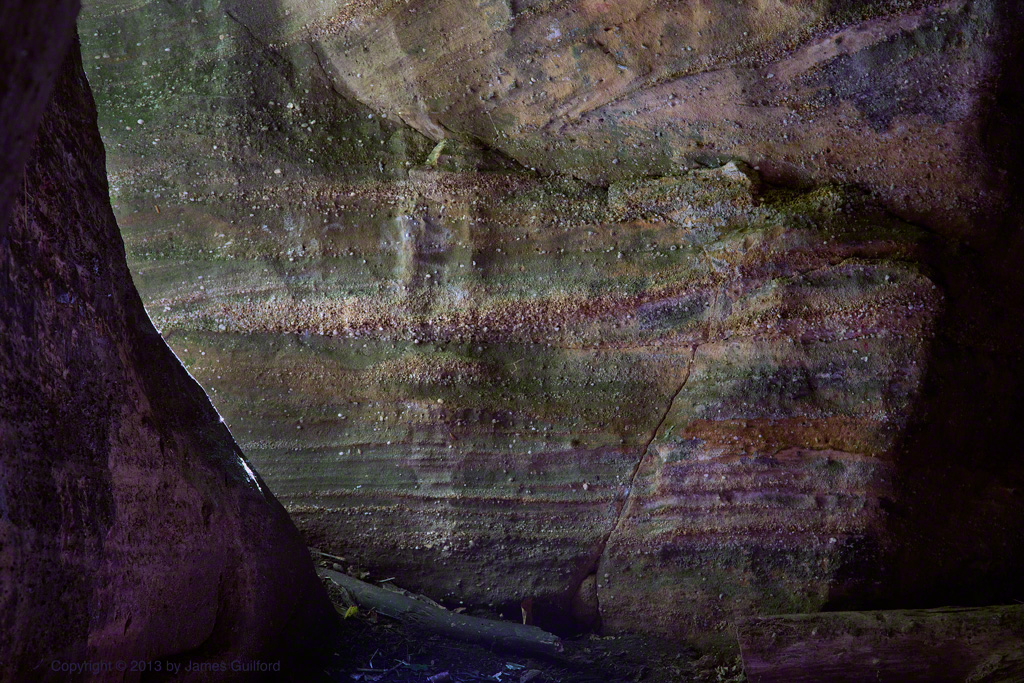 A short spur trail leads visitors to Glacier Cave which is not so much a cave as a deep opening in a rock wall. Cave or not, the exposed rock face was fascinating: strong striations run across the conglomerate rock, tree-filtered sunlight accentuating the textures. Inside the crevasse and looking up, one can see soft light penetrating the open space, caressing moss-covered, sculpted rock. At the bottom of the shaft was a beautiful opening where light, tinted green by tree leaves, bounced off red rocks, illuminating an already-colorful wall.
